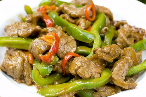 5. Heat 2 tablespoons oil on high in a wok or similar. Add beef and stir quickly, separating the slices. When beef has started turning color with some pink spots remaining, add vegetarian oyster sauce. Stir quickly to distribute. Add peppers back in. Give a few good tosses and serve with rice immediately.