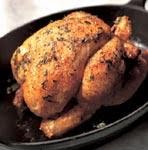Place the chicken in a sauté pan or roasting pan and, when the oven is up to temperature, put the chicken in the oven. I leave it alone—I don't baste it, I don't add butter; you can if you wish, but I feel this creates steam, which I don't want. Roast it until it's done, 50 to 60 minutes. Remove it from the oven and add the thyme, if using, to the pan. Baste the chicken with the juices and thyme and let it rest for 15 minutes on a cutting board.