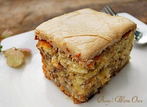 A soft, moist cake filled with bananas and pecans and topped with a creamy caramel frosting make for a luscious treat.