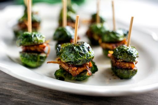 Take one half of a brussels sprout, smear with mustard, add a piece of tempeh cut to fit the size of the sprout, add some onions (I used a melon baller for this). Take the other half of the brussels sprout and position it so the two spouts are like the buns on a burger, with the cut sides facing each other, and secure with a toothpick.