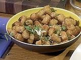 Remove the tater tots from the oven, season with salt and pepper and transfer to a mixing bowl. To the taters, add the garlic, parsley and cheese. Toss to combine and serve immediately.