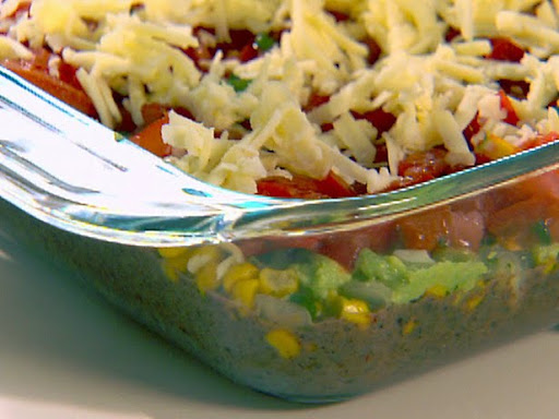 Spread the black bean dip into the bottom of an 8 by 8 glass baking or serving dish. Top with the corn mixture, spreading it out to form a single layer over the beans, repeat with the avocado, then the tomatoes. Top with cheese. Serve with baked chips.