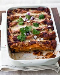 Cover the enchiladas with foil and bake for 45 minutes, until heated through and bubbling; remove the foil halfway through cooking. Let the enchiladas cool for 10 minutes. Serve with chopped red onion, cilantro, hot sauce and sour cream.