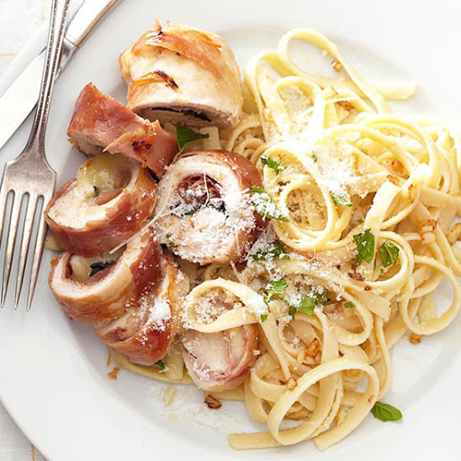 Chicken breasts rolled up with prosciutto, mozzarella, and fresh basil, seared and baked, sliced into medallions and served on top of fettuccine with a butter and garlic sauce.