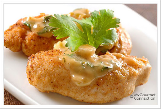 In a shallow dish, combine the flour with 1-1/2 tablespoons of the spicy seasoning blend. You should have about 1/2 teaspoon of the blend remaining - reserve this for finishing the sauce. Dredge the chicken in the flour mixture.
