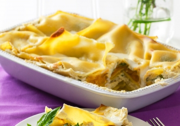 Spread a thin layer of sauce on the bottom of the prepared pan. Arrange 4 lasagna noodles across the pan; it’s okay if they overlap a little. Layer half the ricotta, 4 noodles, sauce, butternut squash, spinach, sauce, 4 noodles, sauce, remaining half ricotta, and 4 more noodles. Top lasagna with remaining sauce, reserving about 1 cup for serving. Noodles should be evenly coated.