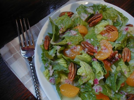 Combine lettuce, oranges and pecans in a large salad bowl. Shake dressing well, pour over salad and toss gently.