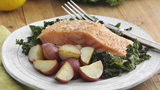 Lemony Roasted Salmon with Potatoes and Kale