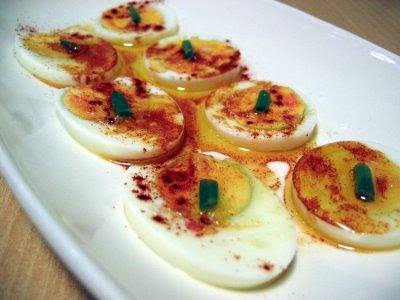 Luego corta los huevos en rodajas finas, ve colocádolos en una fuente de servir. Echa un chorrito de aceite de oliva por encima y espolvorea con un poco de pimentón.