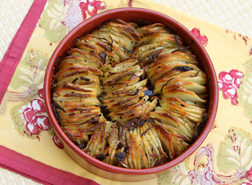 Arrange the slices in the dish as pictured, then wedge some of the shallots, garlic slices, and chopped rosemary between some of the potato wedges throughout the dish.