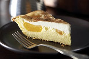 Mix flour, dry pudding mix and baking powder in medium bowl; set aside. Beat egg, milk and butter with wire whisk until well blended. Add to flour mixture; mix well. Pour into greased deep 9-inch glass pie plate; top with peaches. Pour cream cheese mixture over peaches. Sprinkle with cinnamon. Place pie plate on baking sheet to catch any mixture that bubbles over as pie bakes.
