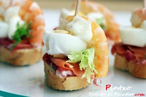 Y realmente solo quedaría montar nuestro pintxo. Sobre unas rebanadas de pan, baguette, ponemos una lonchita de ibérico, otra de salmón ahumado, después el huevo, pero para que no se caiga le cortamos los polos y por la mitad. Después las colas de langostino peladas y por último la salsa
