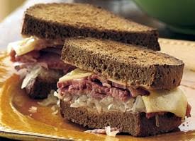 3. Remove beef from cooker; place on cutting board. Let sit for an hour. Cut beef into slices. To serve, spread 1 tablespoon dressing on each toast slice. Using slotted spoon to remove sauerkraut from cooker, top 8 slices toast with 1/2 cup sauerkraut each. Top sauerkraut with beef slices and cheese slice. Top with remaining toast.