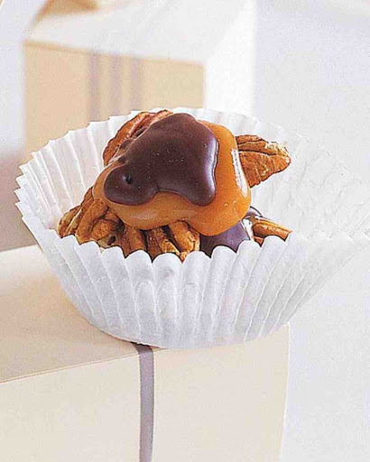 Using a spoon, gently mound 1 tablespoon caramel on top of each cluster. Allow caramel to harden. If caramel becomes too stiff, place bowl over low heat; stir constantly for several minutes until returned to proper consistency.