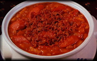 To casserole, add beans, frankfurters, pineapple, brown sugar, chili sauce, bourbon or pineapple juice and coffee granules. Gently stir to thoroughly mix ingredients. Sprinkle bacon over the top.