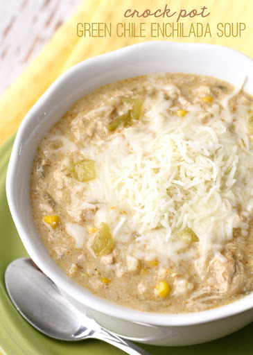 Place chicken broth, enchilada sauce, green chiles, water, cumin, chili powder, onion powder, garlic podwer and shredded chicken in crock pot on HIGH. Cook for 3.5 hours.