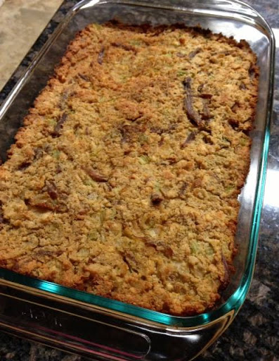 Evenly spread into the bottom of a greased 9x13 baking dish. Bake at 350°F until top turns a golden brown and edges are crispy, this should take about 30 to 40 minutes. Serve warm with turkey gravy.