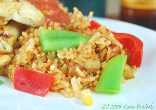 Mexican rice (or Spanish rice) is a staple in Mexican restaurants and one of my favorites. I don't care for refried beans (I figure if they couldn't fry them right the first time, frying again won't help) but rice with some enchilada sauce and an enchilada or two on the side makes me a happy gringo. Note, add some cubed leftover chicken, pork, or beef to the rice while it cooks and you have a delicious and inexpensive meal. (Larger image.) Serves 2.