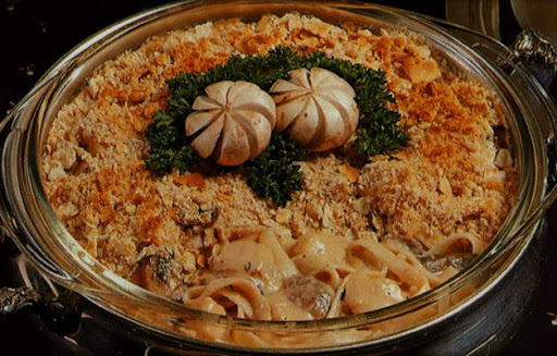 Place fettuccini in baking dish. Pour creamed scallops over.
