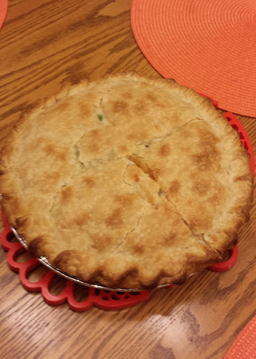 Grease deep dish pie plate and spread crust on bottom. Pour in chicken mixture and top with other crust. Bake 20-25 minutes, until golden brown.