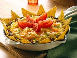 3. Spoon potatoes over corn in skillet; spread evenly. Sprinkle with cheese and remaining 1/4 cup green onions. Cover; cook over low heat about 5 minutes or until cheese is melted. Arrange tomato wedges in spoke fashion over potatoes. Garnish with tortilla chips around outside edge of skillet.