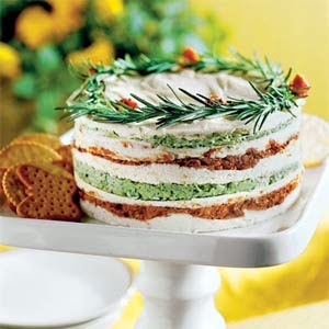 Run a knife gently around edge of pan to loosen sides. Remove sides of pan; carefully remove bottom of pan, and place layered spread on a serving tray. Garnish, if desired. Serve with crackers or baguette slices.