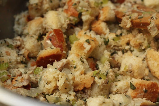 Add the bread, sage and thyme to the bowl with the sausage/onion mixture and stir to combine. Add the chicken broth and stir to evenly coat the bread. Adjust salt and pepper to taste and stir to mix well.