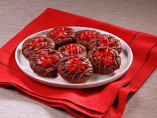 Roll dough into two-inch balls. Place on greased baking sheet or baking sheet lined with parchment paper. Press thumb into center of cookie to make a well. Place cherries into each cookie.