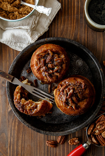 In a small bowl, combine the pecans, brown sugar and salt. Do not skip the salt; the buns taste flat without it. Add 1 tablespoon of the pecan mixture to the bottom of 4 jumbo muffin cups. Or, alternatively, sprinkle ¼ cup of this mixture in the bottom of a small baking dish.