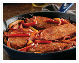 In a large nonstick skillet over medium heat, warm oil. Sprinkle chops with salt and pepper and cook until browned, 3 to 4 minutes per side. Remove chops to a plate and set aside.