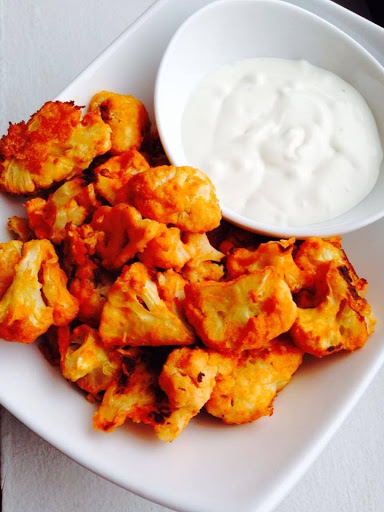 Whisk together until smooth. Toss cauliflower into batter making sure to coat each piece completely, then place battered cauliflower on a lightly greased, non-stick baking sheet. Bake for 15 minutes, tossing half way through.
