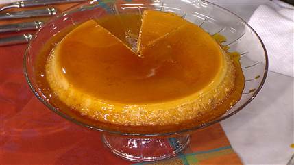 To serve, take a large dessert platter and place on top of the flan mold as if it were a lid. Do this over the sink to ensure no spillage. Quickly flip the pan onto the platter. The flan should come out of the mold perfectly with a beautiful caramel glaze. Enjoy!