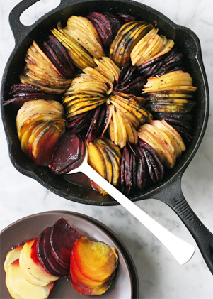 4. Brush half the herbed butter into the base of the skillet and up the sides. Stack 8 to 10 golden beet slices, then lay the stack on its side along the edge of the skillet. Next, stack 8 to 10 red beet slices and lay it next to the golden beet stack , followed by a stack of 10 to 12 potato slices. Continue this pattern until you've formed a ring around the skillet. Repeat the process to fill in the center.
