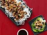 Make a bed of noodles on a platter and top with the chicken mixture. Serve the noodles and stir-fry with lettuce leaves and soy sauce for dipping.