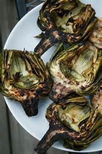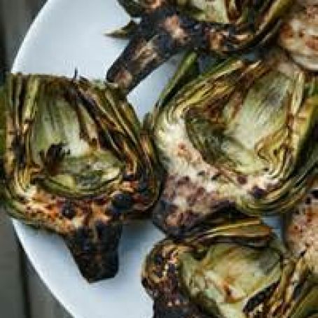 Grill over a barbeque basting with garlic butter until the artichokes are hot.