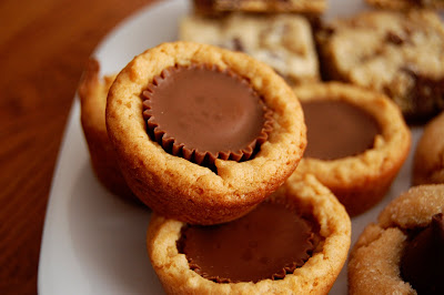 Once you cookie dough comes out of the oven take an *unwraped* p.b. cup and place it on top and centered cookie dough. Take a clean..sanitized finger and press it into the cookie.