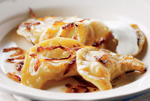 Place on flour-dusted cloth; cover with tea towel. Repeat with remaining dough and filling, rerolling scraps, to make 36 perogies.