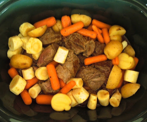 Take meat sprinkle with flour, salt and pepper. Place in hot pan and brown on all sides. Transfer to crockpot. Place rest of the vegetables in crockpot . Stir to combine and cover.