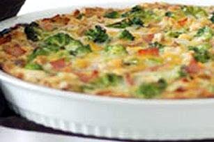 BEAT eggs, milk and sour cream in large bowl with whisk until well blended. Add broccoli, stuffing mix, ham and 1/2 cup cheese; mix lightly.