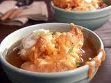 When soup is ready, ladle into 8- to 12-ounce ovensafe bowls and top with two baguette slices. Pile cheese and bacon on top and repeat to make 4 to 6 servings. Place on a baking sheet and place in oven until cheese is melty and browned, about 5 minutes.