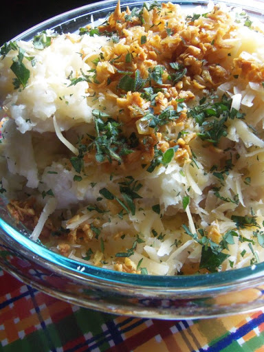 2. When potatoes are fork tender, drain the water and return to pot, add the butter, milk, a pinch of salt and pepper. Using a potato masher, smash the potatoes until they become creamy, but with a few small chunks remaining. Transfer to a big bowl, fold in the garlic, oregano, crushed jalapeño, and Manchego cheese. After well combine, taste for salt. Ready to serve.