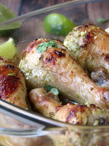 Preheat the oven to 400 degrees. Lightly spray a large baking dish with cooking spray. Take the drumsticks out of the marinade and arrange in the dish in a single layer, without touching each other. Roast for about 40 minutes or until cooked through and the juices run clear when pierced with a fork. If they need a bit more color, turn on the broiler for a minute or two and watch them closely.