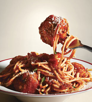 Spaghetti and meatballs get spiced up with a classic Italian sauce. All'amatriciana hails from Amatrice, a town northeast of Rome. Classic all'amatriciana sauce is made from tomatoes, guanciale (salt-cured pig's jowl), and hot peppers. Here, bacon stands in for the guanciale.