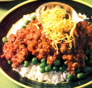 In skillet brown meat with onion; drain off fat. Add tomato sauce, catsup, oregano, hot pepper sauce, salt, water, and pepper; bring to boiling, stirring often. Cook rice and prepare peas following package directions. On individual serving plates layer rice, peas, meat mixture, then cheese.