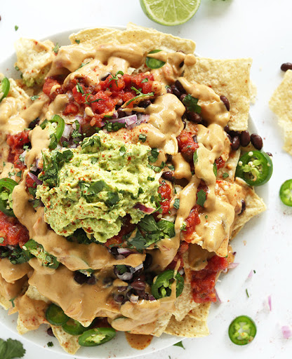 From the minimalist baker. The heartiest most delicious vegan nachos I’ve ever had. Salty, crunchy tortilla chips, fresh guacamole, black beans, salsa all covered in a healthy layer of cashew-less vegan queso!