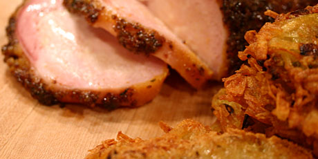 3. Brush glaze over peameal and roast for about 45-50 minutes, basting twice with glaze, until peameal is heated through. Transfer peameal to a large plate and let stand, loosely covered with foil, about 15 minutes. Slice peameal and serve with potato rosti.