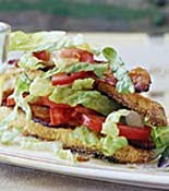On each of 4 plates, layer a piece of tilapia, 2 bacon strips, a pile of salad, another piece of tilapia, 2 more bacon strips and more salad.