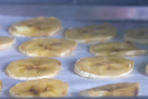 -Squeeze or brush lemon juice on banana slices and place your baking sheet in the oven