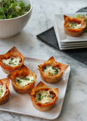 To build the lasagnas, press a wonton wrapper into the base of a muffin cup. Spoon 1 tablespoon of the sauce into the cup. Top with 2 teaspoons ricotta and 1 teaspoon mozzarella. Press another wonton wrapper into the same cup, then top with the sauce and cheeses to finish. Repeat this process until all 12 cups are filled.