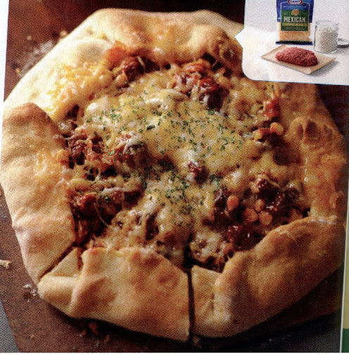 Spoon meat mixture onto center of dough; spread to within 2" of edge. Fold edge of dough over meat, leaving center uncovered.